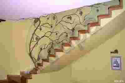 Balustrada wykonana jest z pręta stalowego fakturowanego o zmiennej średnicy co sprawia jej naturalne odwzorowanie pnącza winorośli. Pokryta jest patyną starego złota. Łączenia prętów są cyzelowane. Balustrady w całości powstają w naszej pracowni,z wysokiej jakości pełnowartościowych materiałów. Wszystkie elementy takie jak liście,winogrona,gałęzie,są elementami niepowtarzalnymi co świadczy o walorach rękodzieła artystycznego. Istnieje możliwość nałożenia patyny w innym kolorze.