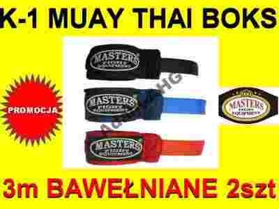 Owijki bokserskie bawełniane, każdy o długości 3m, posiadają specjalny splot zakładany na kciuk zapobiegający zwijaniu się bandaża oraz mocowanie na kciuk.