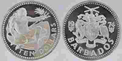 BARBADOS 10 DOLLARS Ag 1974 NEPTUN