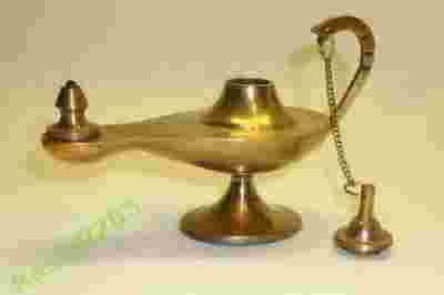 Klasyczna stara lampa oliwna lub naftowa zwana potocznie lampą alladyna. Przedmiot ten został wykonany z solidnego stopu jakim jest mosiądz. Posiada charakterystyczny kształt wspólny dla tego typu wyrobów. Lampa ta zachowała się w doskonałym stanie, wspaniale, naturalnie spatynowana, co podkreśla dodatkowo jej dostojną wiekowość. Wyeksponowana na biurku, kominku, komodzie czy nawet regale czy półce przyciągnie wzrok każdego kto spojrzy w jej kierunku.