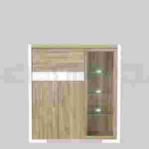 Przedmiotem oferty jest: Barek Home Media P9BSHM04 wyposażony w 3 pełne fronty drzwi i przeszkloną część ekspozycyjną ze szklanymi podświetlanymi półkami.