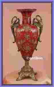 Znakomity duży wazon w barokowym stylu. Wykonano go z krakelurowej porcelany w ślicznym czerwonym odcieniu. Wazon ma stabilną podstawę z brązu, która jest bogato ozdobiona liśćmi akantu. Roślinne, ręcznie malowane wzory na porcelanie urzekają swą misternością. Boki naczynia dekorują spektakularne uchwyty w formie łabędzi. Ptaki te symbolizują piękno, doskonałość i wdzięk a także miłość oraz wierność.