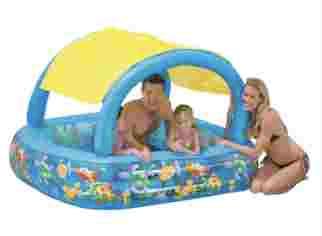 Kolorowy śliczny basen posiada odpinany daszek , który można założyć w upalne dni aby chronił przed żarem słonecznym.