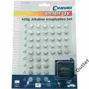 Zestaw baterii guzikowych z testerem Conrad, alkaliczne, 42 szt.