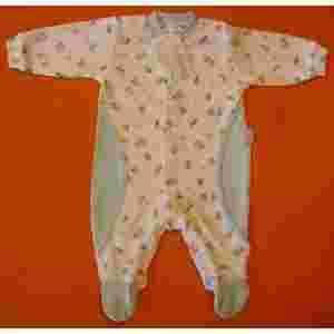 Bawełniany pajac polskiej firmy Szwat w rozmiarze 62 – biały w drobne nadruki, wykończony jasnoniebiesko (jak na zdjęciu). Rozpinany na całej długości tułowia i obu nóżek - łatwy do szybkiego nałożenia niemowlęciu, nie wymaga całkowitego zdjęcia do zmiany pieluszki.