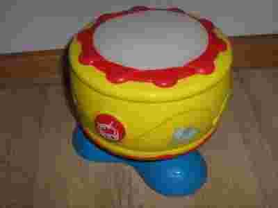 PO WLACZENIU MAMY DWA PRZYCISKI..PO BOKACH BEBENKA WLACZAJAC KAZDEGO Z NICH SLYSZYMY WESOLE MELODIE I RYTMIKE NA BEBENKU POZATYM ON SAM SWIECI ROZNOKOLOROWO