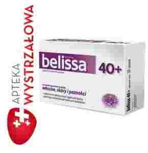 BELISSA 40+ wzmacnia włosy, skórę i paznokcie, spłyca i redukuje zmarszczki. Dostarcza substancji niezbędnych do zachowania włosów, skóry i paznokci w dobrej kondycji. L-cysteina i duża dawka skrzypu polnego wzmacniają włosy, skórę i paznokcie, a L-metionina skutecznie chroni je przed niekorzystnym wpływem środowiska. Koenzym Q10 i kolagen mają działanie przeciwzmarszczkowe - koenzym Q10 opóźnia procesy starzenia, a kolagen ujędrnia i uelastycznia skórę. Dodatkowo belissa 40+ została wzbogacona o witaminy i mikroelementy, dzięki którym włosy, skóra i paznokcie są lepiej odżywione, wyglądają piękniej i dłużej zachowują młodość.