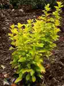 Krzew średnio silnie rosnący, dorastający do 1,5 m wysokości, o wyprostowanych, czerwonawych końcach młodych pędów. iście duże, złoto-żółte, z karminowym obrzeżeniem, jesienią przebarwiające się na pomarańczowo-czerwone, bardzo dekoracyjne.