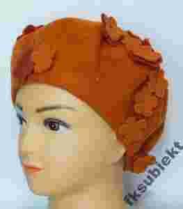 Beret wełniany100% Woolmark rudy posypany kwiatami