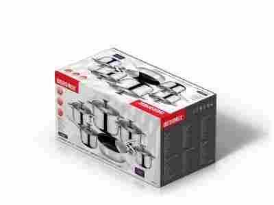 zestaw garnków ze stali 18/10 chromowo-niklowej z kapsułowym dnem wielowarstwowym o podwyższonej grubości 1,5 cm. Stal, z której wykonano naczynia charakteryzuje się tzw. niskim poziomem porowości, dzięki czemu naczynia są łatwe do utrzymania w warunkach higienicznych w gospodarstwach domowych. Stalw porównaniu do naczyń np. z aluminium w wyższej temperaturze nie powoduje dużej migracji cząsteczek do pożywienia.