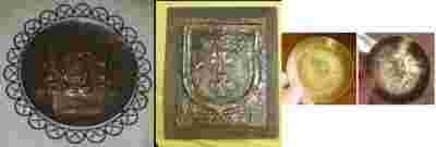 Herb wykonany jest na okraglym talerzu,ktory przyczepiony jest przyspawanymi 4 blaszkami do azurowej miedzianej koronki - obramowania.Jeden dolny zaczep-blaszka nie przylega do talerza, ale nie przeszkadza to ani w wyglądzie herbu,ani w stabilnosci zamocowania talerza. Na tylnej stronie talerza przyspawany jest trojkatny zaczep do zawieszenia.Pod lwami jasniejszy slad o ksztalcie prostokata.