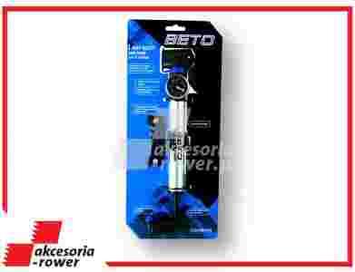 Uniwersalna aluminiowa pompka z manometrem firmy Beto CLD-031AG - z obrotowym manometrem. Pozwala na pompowanie wentyli w zależności od ręcznego ułożenia elementów w głowicy pompki. Precyzyjny manometr pozwala dobrać odpowiednie ciśnienie. Regulowana, ruchoma rękojeść daje dobry chwyt i usztywnia nadgarstek umożliwiając pompowanie w dwóch pozycjach - standardowej oraz "T". Mocowanie do ramy rowerowej w zestawie.