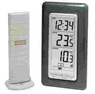 Dane techniczne: zakres pomiaru temperatury w pomieszczeniu -9,9 do +59,9°C, temperatury zewnętrznej -39,9 do +59,9°C, zakres częstotliwości 868 MHz, maksymalna liczba czujników 3, maksymalny zasięg (na wolnej przestrzeni) ok. 100 m, zasilanie stacji bazowej 3 V/DC (2 baterie Mikro LR03, należy zamówić oddzielnie), zasilanie czujnika 3 V/DC (2 baterie Mignon LR06, nie zawarte w dostawie)