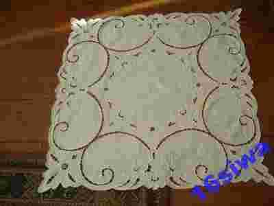 Biały obrusik z haftem richelieu.