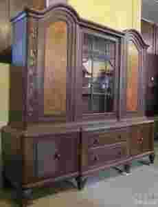 Piękna dębowa biblioteka z fantazyjnym zwieńczeniem części zamkniętych nadstawki. Ten niewątpliwie wyróżniający się formą mebel dodatkowo ożywiają drzwi zdobione czeczotą orzechową. W części środkowej nad szufladami witryna ze skromnymi szprosami. Mebel pojemny, funkcjonalny , nieco uniesiony na lekko giętych nogach.