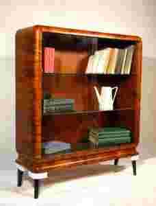 Biblioteczka - witrynka w stylu art-deco wykonana najprawdopodobniej w latach 50/60. Mebelek w super stanie, wewnątrz dwie szklane półki z grubego 5mm szkła. Drzwiczki przesuwane z szyb o grubości 3mm z osadzonymi na nich czarnymi gałkami. Środek czyściutki, zadbany bez zapachów.
