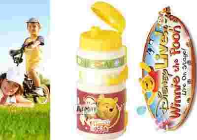 Plastikowy bidon z Kubusiem Puchatkiem. Bezpieczny korek oraz duży otwór do napełniania i mycia czyni go bardzo praktycznym, a podobizna Kubusia Puchatka sprawia, że Twoje dziecko nie będzie chciało bez niego jeździć na rowerku!