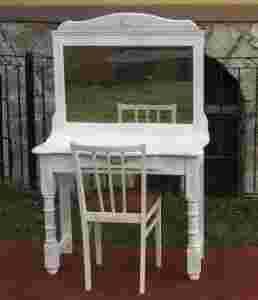 Toaletka składa się ze stolika oraz lustra którego rama posiada delikatnie falowane zwieńczenie wykończone rzeźbieniem.