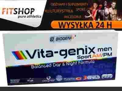 Biogenix Vita-genix™ toperfekcyjnie skomponowane zestawienie witamin oraz minerałów w formie ekskluzywnych chelatów aminokwasowych Albion®, wzbogacone o całą gamę najwyższej jakości standaryzowanych ekstraktów roślinnych, w precyzyjnym doborze których kierowano się przede wszystkim ich wzajemną synergią działania, ale również sumowaniem wpływu z dołączonymi mikroelementami. To właśnie dzięki temu Vita-genix™ men Sport AM/PM stanowi jedyny zasługujący na uwagę, absolutnie kompleksowy zestaw mikroelementów. Jego skład i dawkowanie (kapsułka AM- na dzień i kapsułka PM- na noc) zostały tak dobrane, aby uwzględniać odmienne zapotrzebowanie organizmu mężczyzny w ciągu aktywnego dnia, jak i po jego zakończeniu. Zastosowanie najwyższej czystości witamin, wysoko standaryzowanych ekstraktów roślinnych oraz unikatowych minerałów w formie chelatów aminokwasowych Albion®, gwarantuje maksymalną biodostępność wymienionych składników i najwyższą efektywność ich przyswajania.