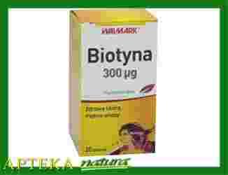 Skład: 1 tabl. zawiera Biotyna 300 mcg. celuloza mikrokrystaliczna, stearynian magnezu, fosforan dwuwapniowy, D-biotyna.