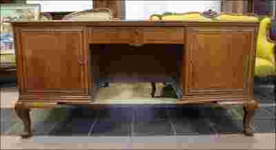 Dwustronne, orzechowe biurko chippendale. W lewej szafce trzy szuflady, w prawej jedna, w środkowej części, tuż pod blatem, szuflada zamykana na klucz.