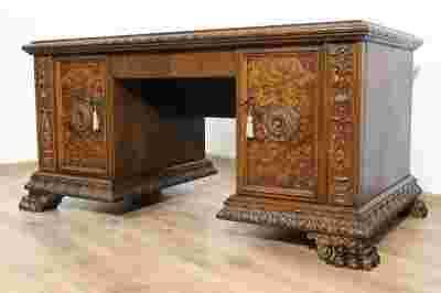 Bogato rzeźbione biurko wsparte na czterech nogach