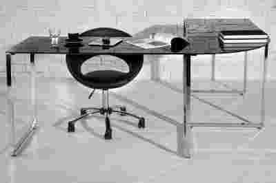 Narożne biurko Big Blazed ma chromowaną, metalową konstrukcje podstawy. Blat został wykonany z hartowanego szkła lakierowanego na czarno.