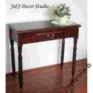 Przedmiotem aukcji jest śliczne biurko z 1 szufladką wykonane w całości z litego drzewa mahoniowego w kolorze ciemnobrązowym (ciemny kasztan delikatnie przechodzący w mahoń). Jest bardzo solidnie i precyzyjnie wykonane. Główny jego atut to piękne, ręcznie wykonane zdobienia. Mosiężne uchwyty. Biurko jest nowe.