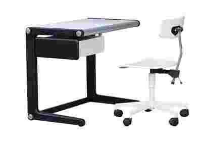 Biurko/ ławka szkolna dla dzieci o wzroście około 128-142cm. Mebel wykonany bardzo porządnie, ciężki - całość metalowa. Szuflada z przegródkami na książki lub zeszyty - istnieje możliwość całkowitego demontażu szuflady. Stan bardzo dobry a nawet idealny. Krzesło Labofa na innej aukcji.