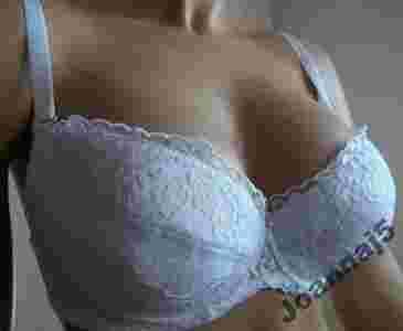 Biały biustonosz o kroju push-up, ładnie wyszyte miseczki, brzegi misek oraz dół mostka ozdabia wystająca koronka. Ramiączka odpinane, regulowane na całej długości. Mostek zdobi świecący klejnocik. Posiada wyjmowane poduszeczki. Rozmiarówka polska.