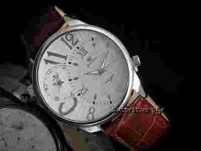 Koperta w kolorze srebrnym , tarcza jasna , cyfry srebrne z połyskiem - dobrze czytelne, wskazówki srebrne . Tarcza ma dwa niezależne zegarki , dzięki oddzielnym mechanizmom można ustawić różne godziny. Pasek w kolorze brązowym , wzmacniany ozdobnymi przeszyciami na krawędziach, wykonany z skóry ekologicznej ( rewelacyjnie imituje naturalną skórę ). Szkło wypukłe- odporne na zarysowania .