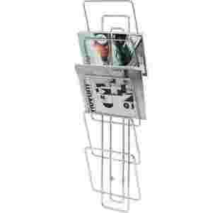Solidny gazetnik wykonany z chromowanego metalu. Zawieszany na ścianę.