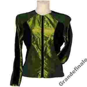 Bluza typ reglan, rękaw długi, zapinana na zamek błyskawiczny, posiada dwie kieszenie boczne ukryte w szwie. Tkanina tafta kreszowana , powoduje iż włosy nie przyczepiają się do ubioru ani nie przedostają się na jego drugą stronę. Krój optycznie wyszczuplający przez zastosowanie cięcia i połączenie kolorów. Kolorystyka jak na zdjęciu.