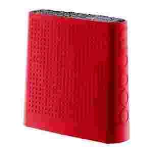 Blok na noże Bodum Bistro w kolorze czerwonym. Blok wykonany z wysokiej jakości tworzywa sztucznego, posiada bardzo nietypowy sposób przechowywania noży; w pojemniku znajduje się wkład z gęstym włosiem, który bardzo sztywno trzyma noże w pojemniku. Noże mogą być umieszczane w bloku pod różnym kątem, a także umożliwia przechowywanie wielu noży o tym samym rozmiarze. Blok nadaje się do noży ceramicznych, jak i stalowych. Jest także łatwy w utrzymaniu czystości.
