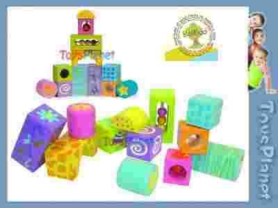 Muzyczne klocki Boikido zawierają lusterko, grzechotki, dzwoneczek oraz koraliki.