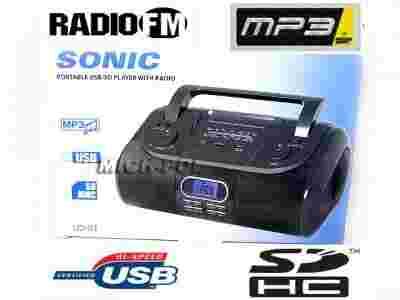 RADIO FIRMY SONIC Z WYŚWIETLACZEM LCD, WEJŚCIEM AUX, ODTWARZACZEM PLIKÓW MP3 ZA POMOCĄ WEJŚCIA SD I USB ORAZ CZTEREMA WBUDOWANYMI GŁOŚNIKAMI CO DAJE SUPER BRZMIENIE