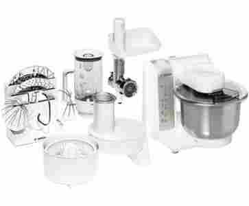 1 x Pokrywa, 1 x Rozdrabniacz do jarzyn (przelotowy), 1 x Miska do mieszania ze stali szlachetnej, 1 x Lejek, 1 x Maszynka do mielenia miesa, 1 x Haki do zagniatania ciasta, metal, 1 x Dzbanek miksera ze szkla, 1 x Tarcza do tarcia, dwustronna, 1 x Mieszadla do ucierania, 1 x Tarcza do ciecia, dwustronna, 1 x Popychacz, 1 x Wyciskarka do owoców cytrusowych, 1 x Uchwyty na wyposazenie |