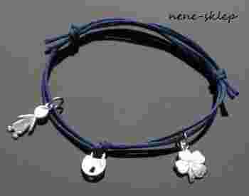 Przedmiotem aukcji jest sznurkowa regulowana bransoletka zdobiona trzema zawieszkami: koniczynką, kłódką i ludkiem ze srebra 925.