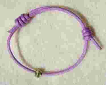 Przedmiotem aukcji jest bransoletka wykonana z fioletowego (jasny odcień) sznurka woskowanego, z dodatkiem posrebrzanego elementu ozdobnego, widoczna na zdjęciu. Długość regulowana, ale raczej na drobną dziewczęcą rękę, szczupłą dłoń. Może być nawet dla dziewczynki :)