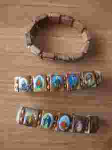 BRANSOLETKA DREWNIANA JASNA Z WIZERUNKAMI ŚWIĘTYCH