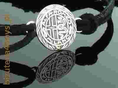 Bransoletka wykonana z naturalnego rzemienia oraz srebra najwyższej próby 0,925., potwierdzonej znakami probierczymi.