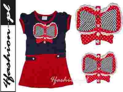 BREEZE sukienka z KOKARDĄ groszki paski granat 128