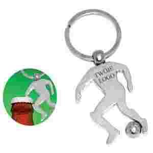 Brelok do kluczy w kształcie piłkarza z funkcją otwieracza, wykonany z chromowanego metalu. Brelok pakowany jest w czarny kartonik.
