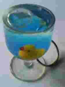 10. Kieliszek, wypełniony niebieskim płynem, a w środku pływa żółta kaczuszka.