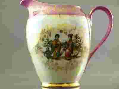Artykuł wykonany z wysokiej jakości porcelany,całość perłowa z wkomponowaną,dwustronną scenką orientalną, zagęszczoną w ciekawej tonacji barw,dodatkowo mlecznik podkreślono kilkoma rzucikami kwiatów w złocie,przy górnej krawędzi dookoła przebiega barwny pas ze wzorem roślinnym,ucho barwne wzbogacone złotem,wylew subtelny bardzo ładnie wymodelowany,przy podstawie gruby,złocony pas.Dekoracja elegancka,ożywiona złotem wyróżnia ten przedmiot.