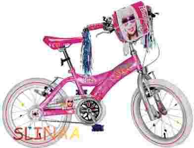 16” rowerek w przepięknej bajkowej stylistyce , jasne i żywe kolory zachwycą nawet najbardziej wybredną przyszłą rowerzystkę. Rower posiada bardzo wytrzymałe i odporne na ścieranie opony pneumatyczne, osłona łańcucha doskonale chroni przed urazami i zabrudzeniem, stalowa wzmacniana rama, hamulec przedni i tylny ręczny dla większej wygody i poczucia bezpieczeństwa. Dodatkową atrakcją są frędzle doczepione na uchwyty oraz plecaczek, który można zarówno przypiąć do roweru jak i nosić na plecach. Cały rowerek został wykonany w stylistyce Barbie, nawet w najmniejszym szczególe począwszy od kolorów i naklejek poprzez opony, gdzie umieszczono wizerunki głowy lalki, na szprychach można przyczepić kolorowe serduszka, a linki hamulcowe i kierownica pokryte zostały brokatem!