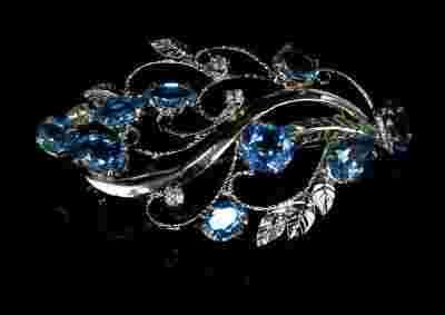 Przedmiotem aukcji jest srebrna secesyjna broszka wykonana ręcznie z naturalnymi kamieniami topaz niebieski.