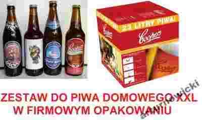 Zestaw podstawowego sprzętu i surowców do wykonania domowego piwa - wersja XXL rozszerzona i pakowana w firmowy karton.
