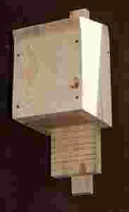 Budka wykonana z grubych desek 2,5cm zbita solidnymi gwoździami nie zszywkami co gwarantuje trwałośc.Budki spajane za pomocą zszywek po dobrym deszczu nasiąkają wodą i ponownie wysychają rozszczelniając się i krzywiąc na skutek korytkowania desek (drewno jest materiałem chłonącym wodę i wysychającym jak gąbka -rozszczelnia się pod wpływem ciepła i uszczelnia ponownie jak nasiąknie wodą). Deski spojone zszywkami korytkując wyciągają zszywki ,natomiast gwoździe czy wkręty trzymają na tyle mocno ,że uniemożliwiają korytkowanie drewna. Otwór wejściowy znajduje się na spodzie budki ,ma wymiary 10*2cm Dostęp do otworu wlotowego nietoperzom ułatwia nie heblowana deska spodnia i drabinka złożona z wielu cieniutkich nacięc. Nacięcia znajdują się również wewnątrz budki co ułatwia nietoperzom zaczepienie się i zawiśnięcie w środku. Otwór wlotowy o szerokości 2cm jest dla nietoperzy wystarczający ,natomiast uniemożliwia penetrację budki przez drapieżniki.