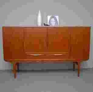 Highboard o wysokim standardzie wykończenia. Obrzeża i konstrukcja nóg z masywu tekowego. Owal i płynne przejścia. Półki i szuflady drewniane. Całość bez paździerza. Produkt duński lat 60-tych.